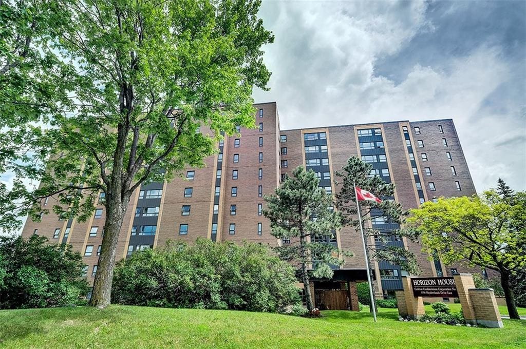 BEAUTIFULLY RENOVATED AND VERY AFFORDABLE CONDO. Great for owner or investor located in a super location and close to all the amenities of Merivale Road. This large bright and cheery north and west facing two bedroom unit bathes in afternoon sunshine. Gorgeous kitchen with new stainless steel appliances, granite counters and seating area, tiled backsplash, loads of cupboards, and pot lighting. New laminate and tiled flooring. Spiffy updated bathroom. Solarium renovated and opened into the main living area. New circuit breaker electrical panel with ESA certificate. Ensuite storage as well as an indoor locker plus indoor parking. 10,000 BTU New air conditioner included. Note condo fees includes heat and hydro and all amenities including party room and gym. Low property taxes. Shared laundry room in basement. Upgraded outdoor salt water swimming pool. 2 guest suites and visitor parking. Very well run condo with many upgrades to the building. Large reserve fund. Note Horizon House as the building is called was the first condo building in Ottawa and Canada and has a CCP nbr 1. Just celebrated a 50 year anniversary and resident owners are very proud of this building. Note pets are not allowed. Parking A 35, Locker Rm L1-Locker 29. Call Barry now to view.