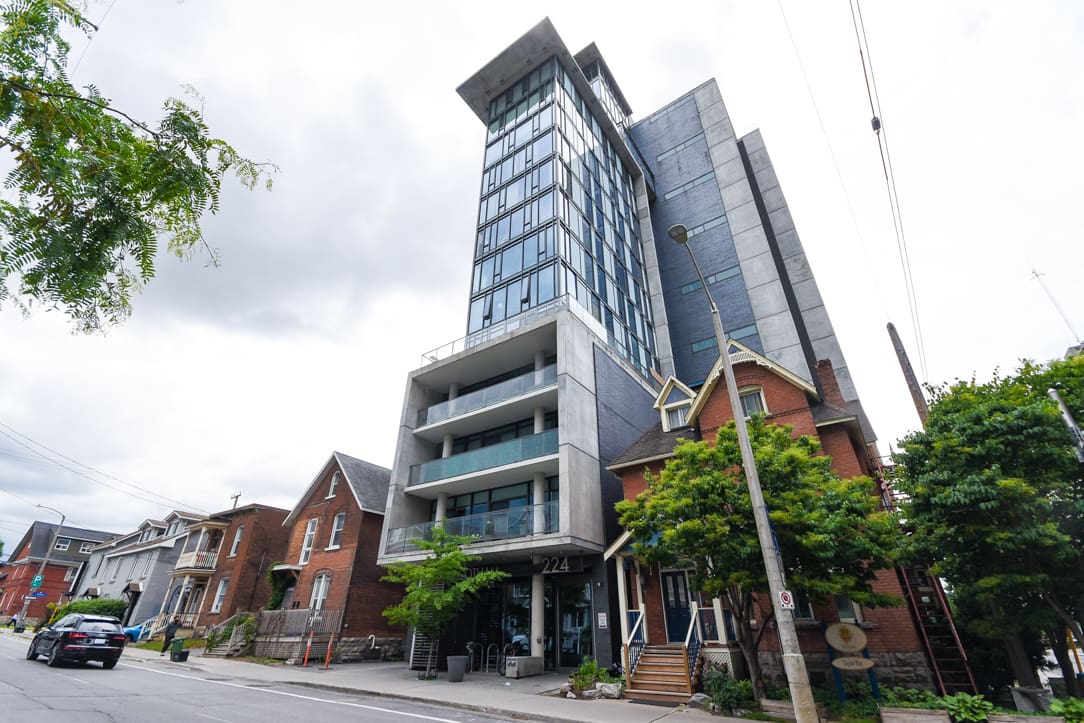 DON’ MISS THIS SUPER MODERN DOWNTOWN CONDO WITH “INDOOR PARKING”. PETS ALLOWED. Welcome to GOTHAM. Featuring 9 ft ceilings with large windows for much natural light. Super trendy interior finish mix of drywall and exposed concrete. All hardwood and tiled flooring throughout (No Carpet). Quartz countertops and stainless steel appliances. Convenient ensuite laundry. Large south facing balcony. Concierge service, security communication system with entry, lobby, and garage surveillance. Super location to many downtown amenities and a short walk to the LRT West Station on Queen St between Lyon and Kent. Condo fee covers all except hydro. Other is 75 sq ft. outdoor balcony living space.